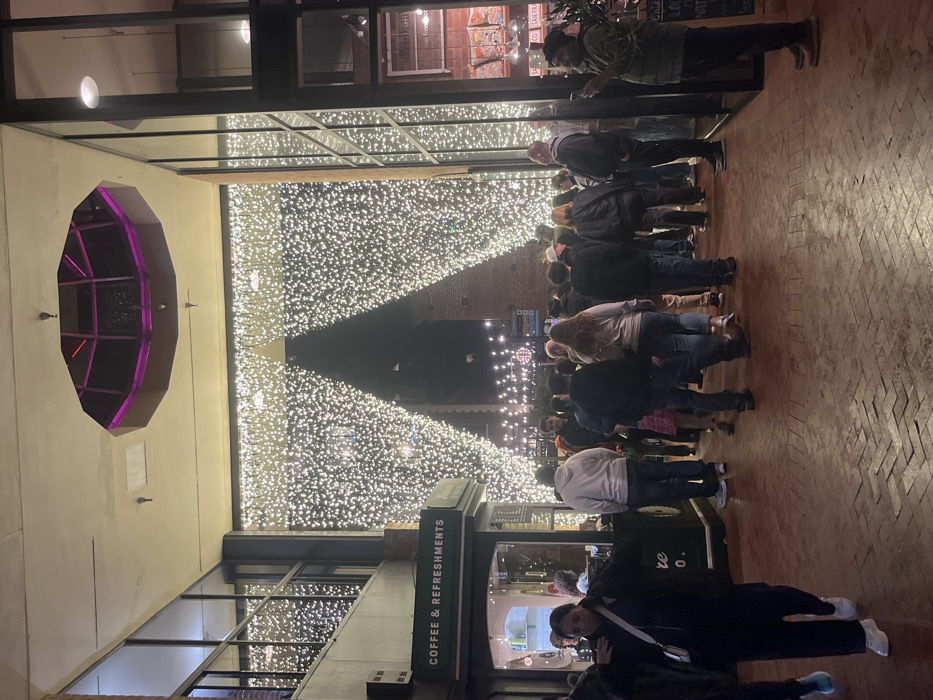A crowd gathers in an outdoor venue decorated with strings of white lights, forming a triangular pattern overhead. People are standing in a group, some with their backs to the camera. A building with a unique, purple-lit architectural feature is visible to the left, while a "Coffee & Refreshments" stand is seen in the lower portion of the frame. The scene is illuminated, suggesting an evening or nighttime setting.