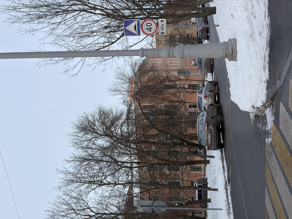The image depicts a winter street scene in Kronstadt, Russia, under an overcast sky. In the foreground, a gray ornate street lamp post stands on the right, partially surrounded by melting snow and dirt. Attached to the lamp post are three road signs: a blue square sign indicating a speed bump, a red circular sign displaying "40" for a 40 km/h speed limit, and a white rectangular sign with two upward arrows and "10m", likely signifying distance or duration of the restriction. The asphalt road, partially wet from melting snow, features a zebra crossing visible in the bottom left. Piles of snow accumulate on the curbs and verges to the right and left of the road. Several vehicles are parked along the left side of the street. Prominently featured are a dark gray Renault Fluence sedan (license plate B 972 TV 98) and a light-colored Chevrolet Aveo sedan parked consecutively. Further down the street, additional parked cars are visible, including a light blue/green SUV and a dark sedan. Numerous deciduous trees with bare branches, characteristic of winter, line both sides of the street, partially obscuring a multi-story building in the background. This building exhibits a light peach or pinkish-orange facade with numerous rectangular windows, suggesting older European architecture. No people or active interactions are visible in the scene. The overall environment is cold and muted, with minimal shadows due to the overcast conditions.