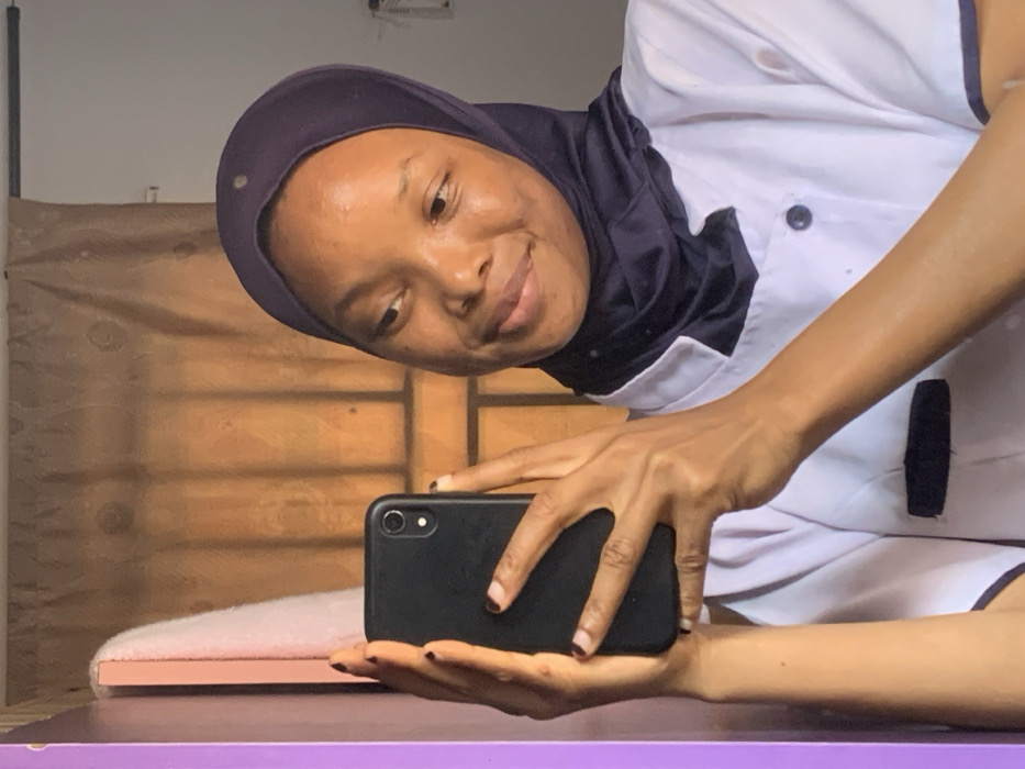 A woman wearing a navy hijab and a white uniform with navy trim is taking a selfie