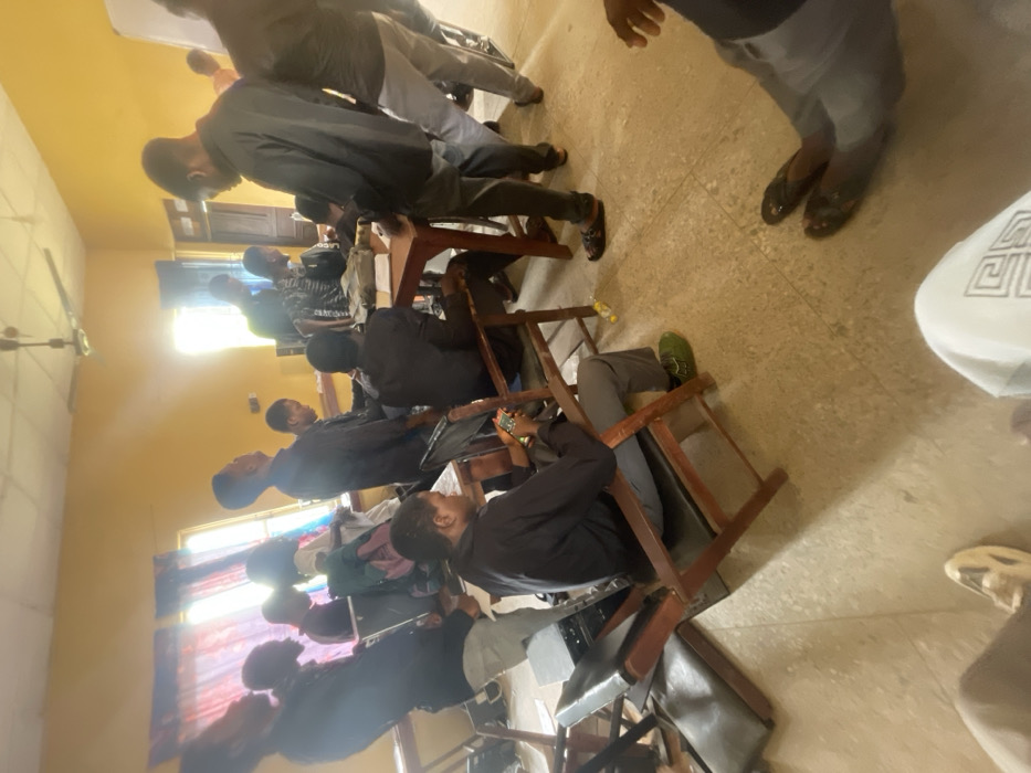 This image displays an indoor scene within a room in Uturu, Nigeria. The room features mustard-yellow painted walls, a light-colored tiled floor, and a ceiling fan. Bright natural light streams through a window on the left side, covered by patterned curtains. Approximately 10-12 young adult males are present. The majority are wearing black long-sleeved shirts and various trousers, including grey and dark shades. In the foreground, a male individual is seated in a dark wooden chair with a dark upholstered seat, actively viewing a smartphone. He wears grey trousers and green athletic shoes. Next to him on the floor, an overturned dark wooden chair and a dark rectangular object resembling a computer tower are visible. In the mid-ground, multiple males are gathered around a rectangular wooden table. Some are standing, while others are seated in similar wooden chairs. Items, consistent with books or papers, are visible on the tabletop. One male standing at the table is looking downwards. Other individuals are standing or sitting throughout the room, with some appearing to direct their gaze towards the back of the room or upwards. A small, empty yellow plastic bottle lies on the floor near the table. A dark wooden door is partially visible in the background, towards the right.