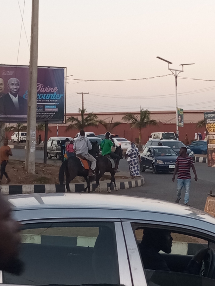 This image shows a busy street scene in Jos, Nigeria, during what appears to be late afternoon or early evening, characterized by an orange-pink sky. In the foreground, the top of a silver sedan is visible, with the silhouette of a male driver, distinguished by a beard, seen through the driver's side window. The midground focuses on a multi-lane road or intersection featuring a central curb island painted with black and white stripes. Two dark-colored horses, each with a rider, are walking on the road near this island; the lead rider is dressed in light grey with an orange saddle pad, and the second rider wears a green shirt. Several pedestrians are also present: a man in a red and white striped shirt and blue jeans walks to the right of the horses, facing left. A woman in a patterned white and blue dress with a head covering stands near the curb island. Another man in a brown shirt is partially visible on the far left, walking away from the viewer. Vehicular traffic includes a dark blue sedan positioned behind the horses, a white minivan further back on the left, and other indistinct vehicles. To the left, a large billboard displays an advertisement for a "Divine Encounter" event, featuring images of two men in suits and the dates "13TH & 14TH JAN." Utility poles, overhead power lines, and a streetlight with solar panels are visible. The background reveals buildings with reddish-brown roofs and scattered palm trees under the expansive, clear sky.