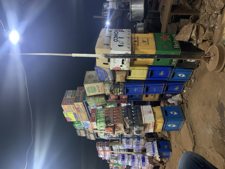 A towering makeshift structure constructed from a variety of boxes and crates dominates the scene. Some boxes are labeled "KROMCO APPLES", "TOPCAFE", "INSECT POWDER", "Free 2 Lambo", "MONSTER", and "PERFECT". Crates display brands like "Heineken" and "Guinness". Cases of bottled water are stacked at the base. A light pole, emitting a strong glare, stands nearby. Several cooking pots are visible in the background.