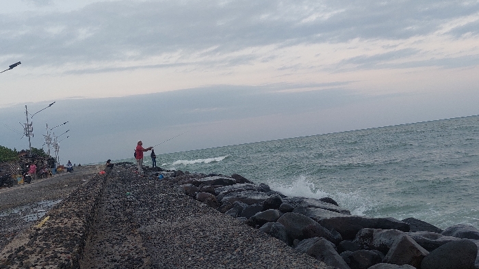 The image depicts a coastal scene in Lhokseumawe, Indonesia. A dark, granular-textured path or road runs along the left side of the frame, bordered on its right by a substantial breakwater constructed from large, dark grey rocks. White-capped waves are observed crashing against these rocks, producing foam and spray. On the breakwater, two individuals are actively engaged in fishing. One person, wearing a red top and light-colored pants, stands prominently in the mid-ground, holding a fishing rod extended over the water. A second individual, dressed in dark attire, stands further to the right on the rocks, also operating a fishing rod over the sea. Along the coastal path to the left, multiple tall streetlights with complex fixtures are visible. Several motorcycles are parked or in transit on the path, and approximately 5-7 additional people are discernible, standing or moving near small structures or vegetation. The sea occupies the right half of the image, displaying a choppy, grey-green surface with visible waves extending to the horizon. The sky above is uniformly overcast with layers of grey and white clouds, indicating diffuse lighting.
