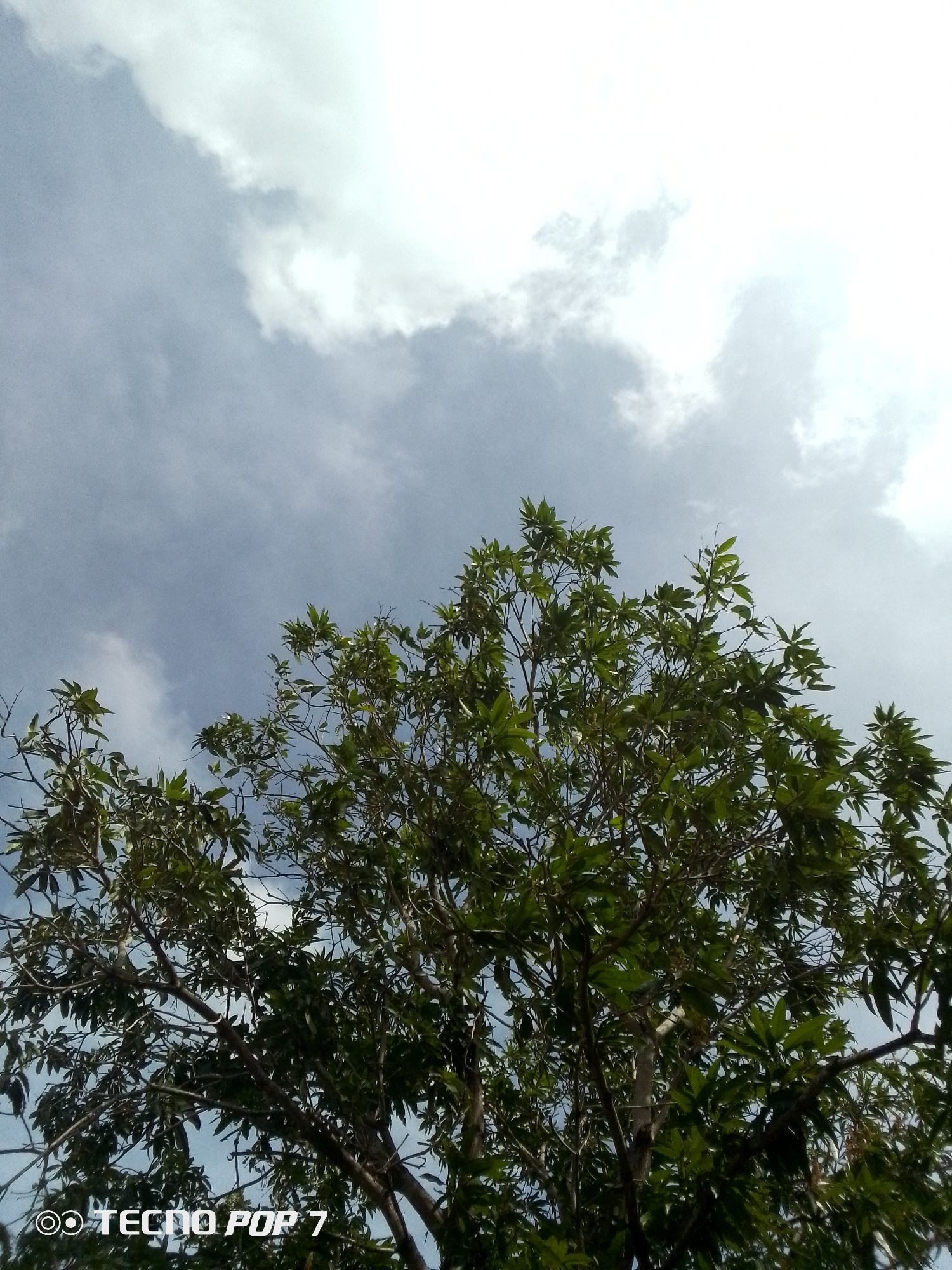 The image captures an upward view of a tree canopy against a partly cloudy sky, originating from the city of Altagracia, Venezuela. The upper two-thirds of the frame consist of a light blue to greyish-blue sky, featuring several white cumulus clouds. A brighter, possibly sun-illuminated area is visible towards the upper right. The lower third of the image is dominated by the dense, green foliage of a tree, with numerous leaves of varying shades and visible brown branches and twigs extending throughout the lower portion of the frame. No individuals, actions, or specific interactions are depicted. A digital watermark "@@ TECNO POP 7" is present in the lower-left corner.