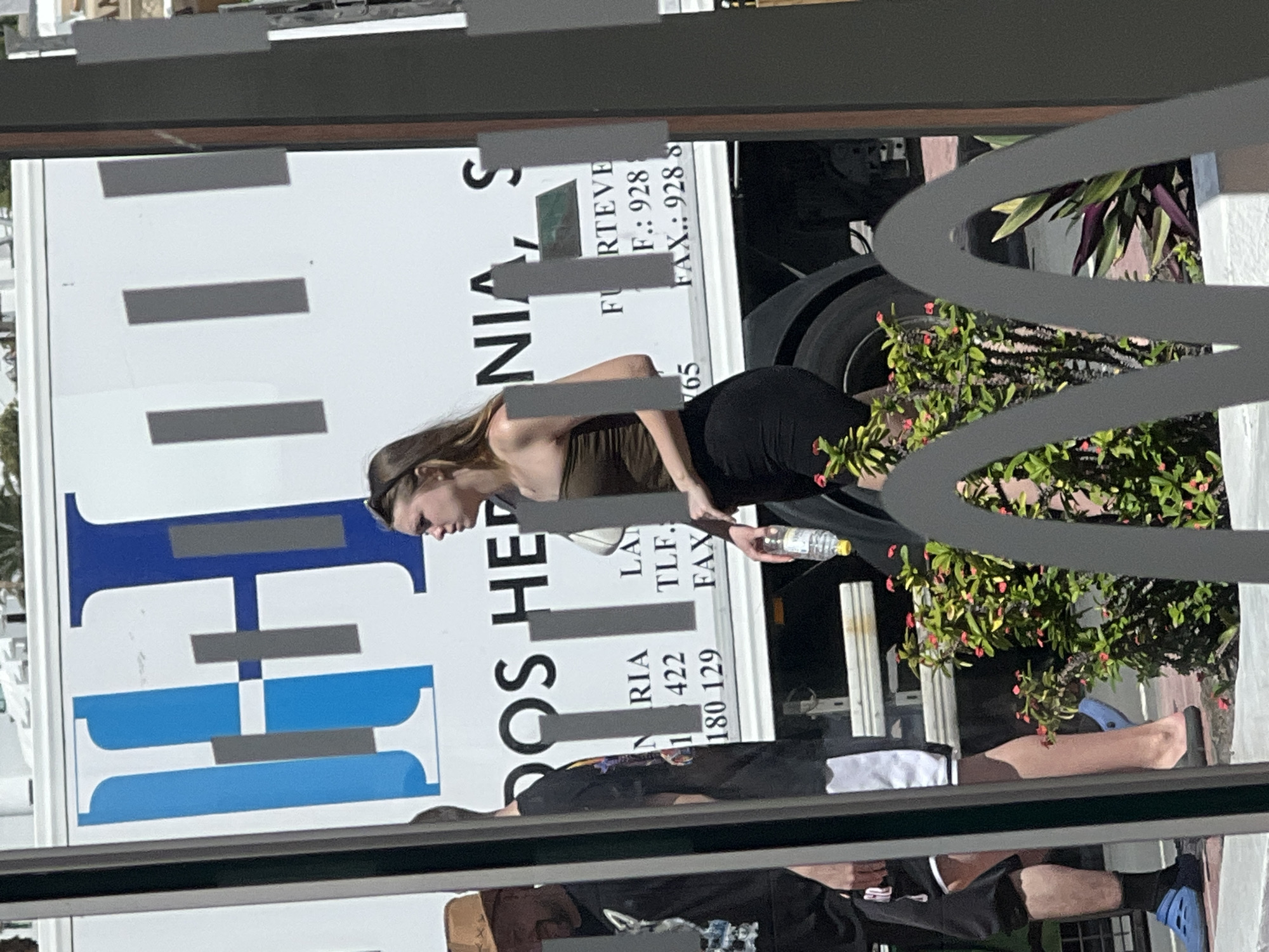 A daytime, eye-level photograph captures three individuals walking rightward on a paved surface, viewed through a reflective glass or panel in Puerto Rico, Spain. In the background, a large white truck is visible, featuring a prominent blue and grey "H" logo and black Spanish text including "DOS HE...", "NIA", "S", "RIA", "LA", "TLF.", "FAX.. 928 8", and various numerical sequences. The main subject, a young adult female with long brown hair, positioned centrally, wears an olive-brown strapless top and black shorts, carrying a white shoulder bag and holding a clear plastic water bottle with a yellow cap. To her left, partially obscured, is a male with a light brown straw hat and beard, wearing a dark t-shirt and shorts, with blue slide-sandals on his feet. A second male, visible between the two, wears a dark t-shirt and dark shorts with white trim. The foreground includes several bushes with small red flowers and green foliage, along with variegated plants. The scene is brightly illuminated by natural sunlight.
