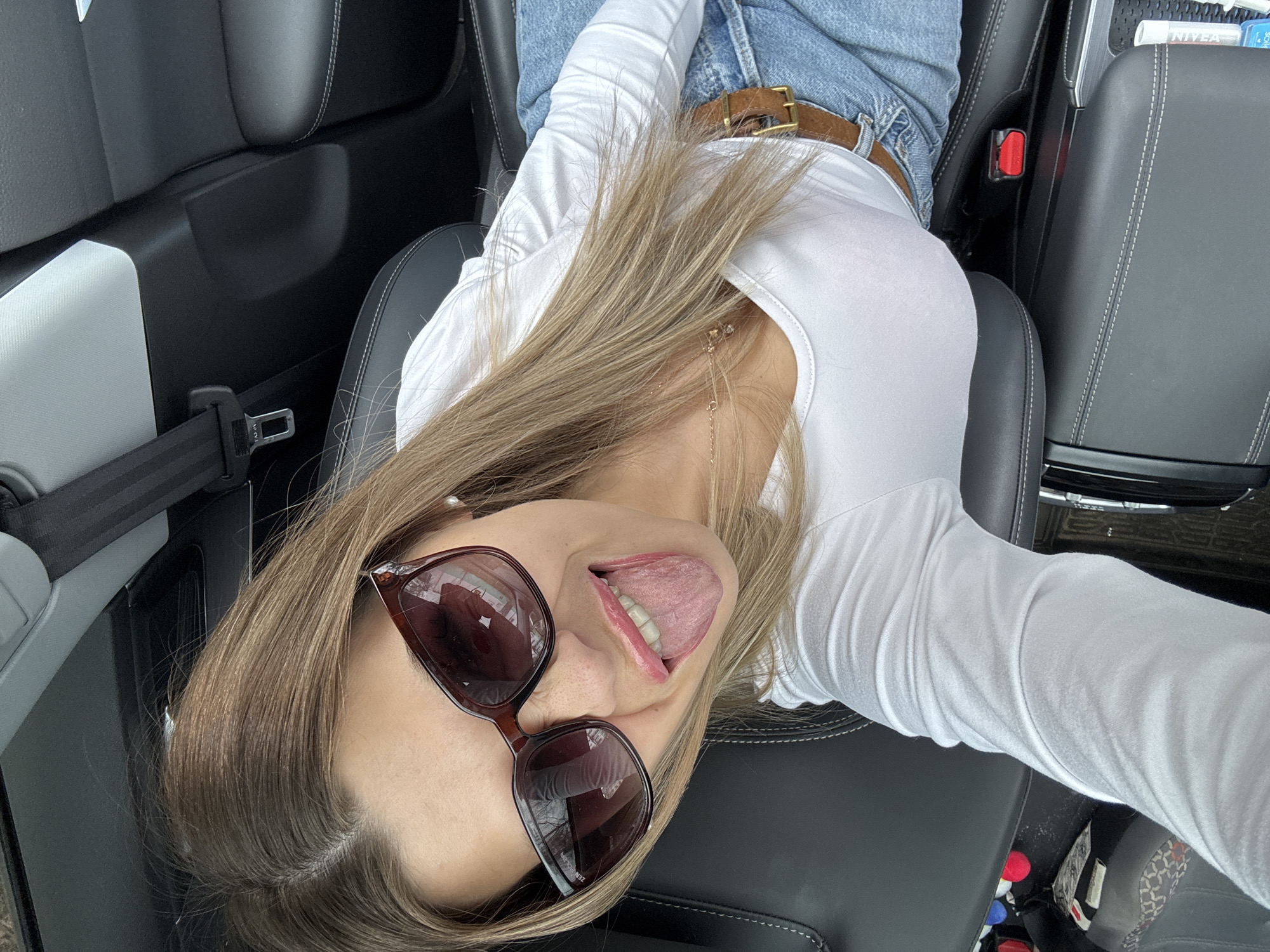 A woman is sitting in the passenger seat of a car. She is wearing sunglasses, a white long-sleeved shirt, and jeans with a brown belt. She is sticking her tongue out. The car has black leather seats and a gray interior. The image was taken in Chaikovsky, Russia.