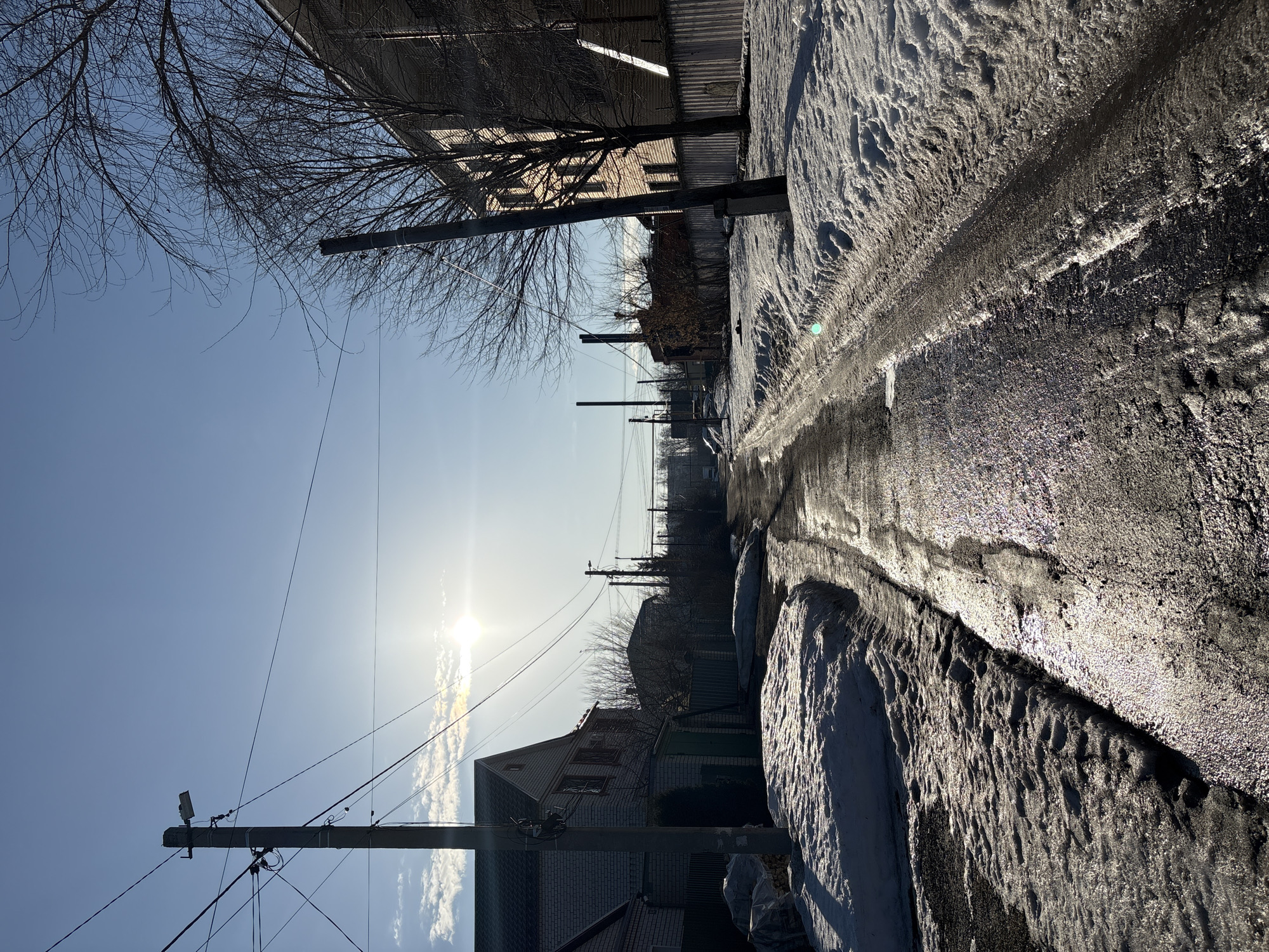 The image depicts an unpaved or poorly maintained residential street in Ulyanovsk, Russia, under bright, low sunlight during late winter or early spring conditions. The sun, positioned low in the left quadrant of the sky, casts significant glare and creates specular reflections on the wet, icy, and slush-covered road surface, which extends into the background. Dirty snowbanks with visible tire tracks line both sides of the street. On the left, a prominent dark utility pole with numerous overhead wires and a street light fixture stands in the foreground, partially obscuring a two-story light-colored brick or sided house with a dark gabled roof. A green garage door is visible on an adjacent structure. Piles of plastic-covered material are located near a metal fence further down the street. On the right, a multi-story building with multiple windows, possibly residential or industrial, is partially silhouetted behind bare deciduous trees. A tall corrugated metal fence runs along this property. Additional utility poles, distant buildings, and what appear to be industrial chimneys or pipes are visible in the far background, with a white vehicle partially discernable. The scene is devoid of human presence or activity.