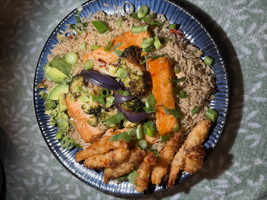 A plate of food featuring brown rice, cooked salmon, and fried shrimp. Chopped green onions are sprinkled throughout the dish. Additional ingredients include roasted broccoli, purple onions, and sliced avocado. The dish is presented on a blue-rimmed plate set on a light green patterned surface.