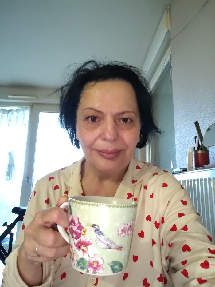 - "A woman in heart-patterned pajamas holds a floral mug with a bird design" by FM-Odse83, licensed under CC BY 4.0