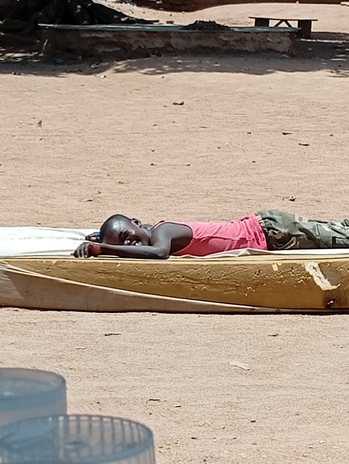 The image portrays an outdoor scene in Gboko, Nigeria. A dark-skinned individual, appearing youthful, is depicted lying prone on a white mattress positioned atop a light-colored wooden frame. The individual wears a pink sleeveless shirt and camouflage-patterned trousers. Their head rests on folded arms, and a smiling expression is visible on their face. The ground is composed of dry, light brown soil or sand. In the background, a low concrete structure, a wooden bench, and shadows cast by unseen foliage are present. In the immediate foreground, two out-of-focus transparent cups are partially visible at the bottom left.