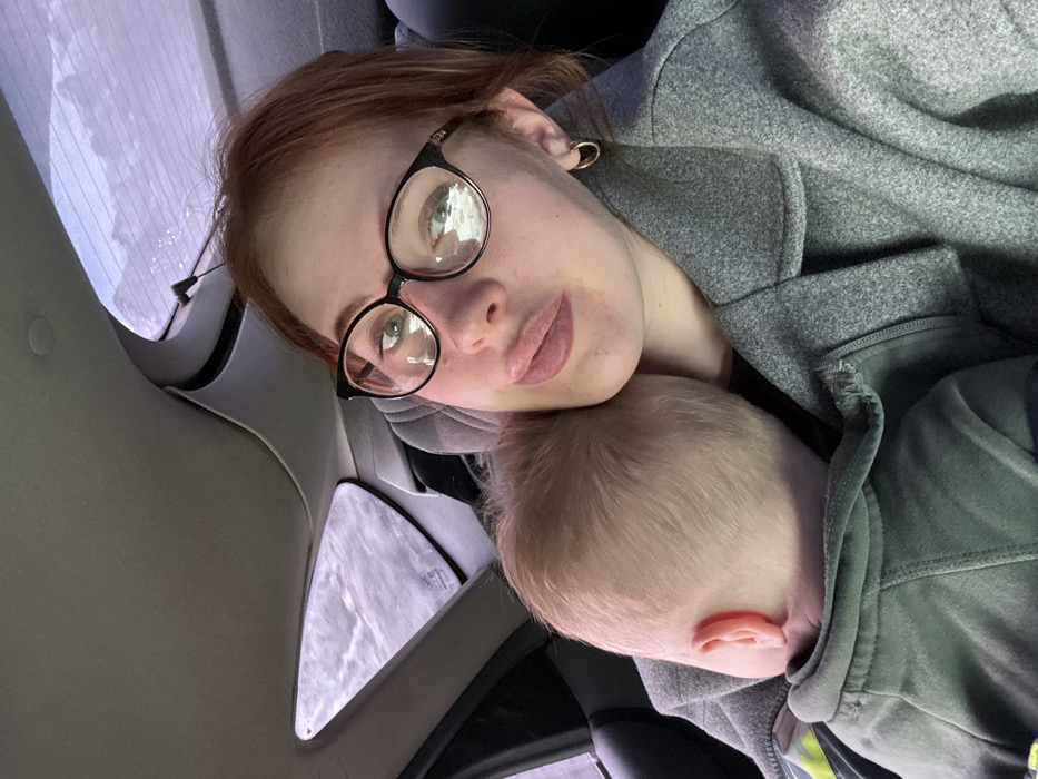 An indoor photograph depicts an adult female and an infant inside what appears to be a vehicle in the city of Noviy, Russia. The female, positioned on the right side of the frame, has reddish-brown hair, green eyes, and wears dark-rimmed glasses along with a light grey coat. She is making a puckered lips expression and is looking directly at the camera. To her left, an infant with light blonde hair is partially visible from the back of their head and upper torso, resting against the female's left shoulder. The infant is wearing a dark olive green hooded garment. The vehicle's grey headliner is visible in the upper portion of the image. Through the vehicle's windows, a snow-covered or icy exterior environment is discernable, indicating cold weather conditions.