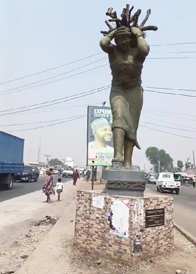 bronze statue of a woman carrying a bundle of sticks on her head. The statue stands on a brick-like pedestal on a traffic island or median in a busy street. There is a billboard behind the statue with a portrait on it. Cars, buses, and auto-rickshaws are seen driving on the road. People are walking along the side of the road. Overhead power lines run across the top of the shot. The day is bright and sunny.
