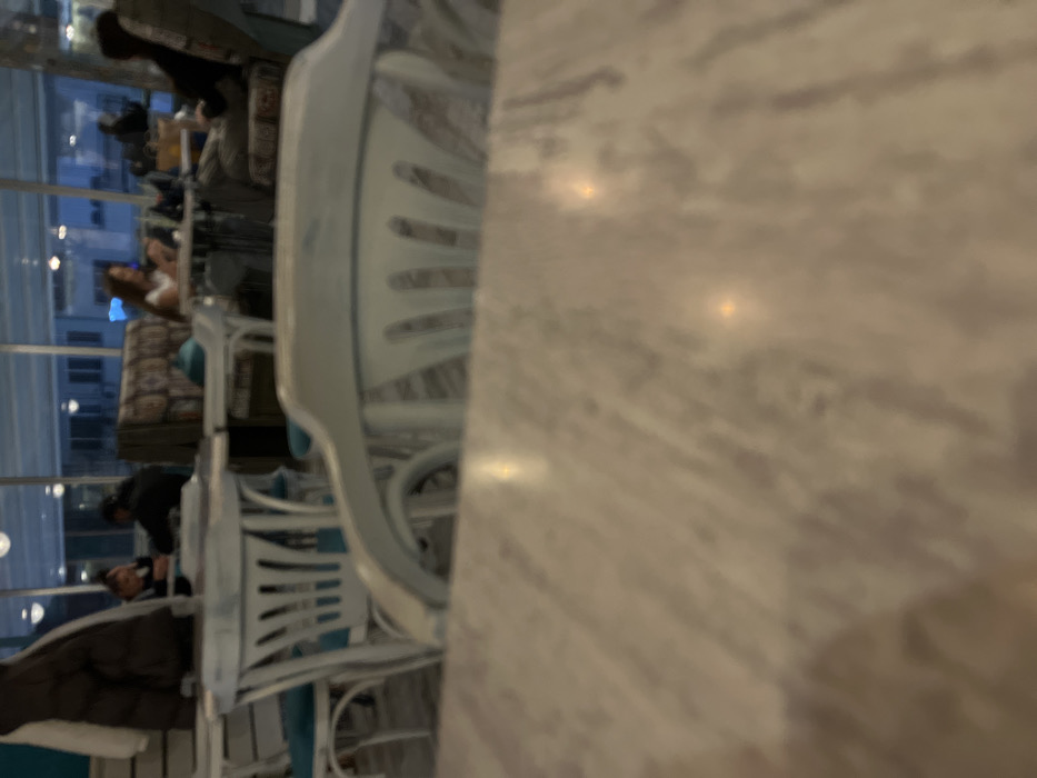 The scene depicts the interior of a commercial establishment, likely a cafe or lounge, situated in Stara Zagora, Bulgaria. The lighting conditions indicate evening or night, with artificial illumination dominating the interior and a dark exterior visible through large glass panels. In the immediate foreground, a light-colored tabletop with a subtle veined or mottled pattern is visible, reflecting multiple points of light. Directly behind this table, the upper portion of a light-colored, curved-back chair with vertical slats is present. The midground contains several similar light-colored tables and chairs, equipped with light blue seat cushions. On the left side of the midground, a dark, possibly puffer-style, jacket is draped over a chair back. In the background, multiple individuals are seated at various tables. Two figures are positioned on the left, one exhibiting dark hair in profile, directed downwards. Towards the center-right, a female individual with long dark hair is seated, also looking downwards. A further individual is seated on the right in a patterned, upholstered armchair. The establishment's rear wall consists of large glass panels, offering a blurred view of the outside environment featuring distant light sources. Overhead, multiple spherical light fixtures are discernible.