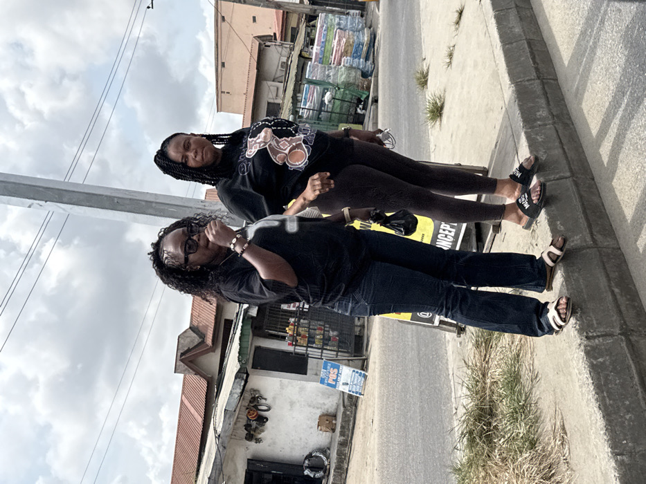 Two adult females stand on a concrete curb next to an asphalt road in Ado, Nigeria, under an overcast sky. The woman on the left wears a black t-shirt, dark blue jeans, and light-colored sandals. Her dark, curly hair is partially braided, and she wears dark sunglasses. Her right hand is near her mouth, while her left hand holds a small black bag and a shell-beaded bracelet is visible on her wrist. The woman on the right wears a black t-shirt with a graphic design, dark leggings, and black "MIAMI" slide sandals. Her dark hair is braided. Her left hand holds a small white object, and her right arm is by her side. Behind them, a gray utility pole stands centrally. To the left, a white building with a corrugated metal roof functions as a shop, displaying items such as tires, small containers, and a blue "POS" (Point of Sale) sign. Further right in the background, another building with a lighter-colored roof is visible, along with stacks of packaged goods. Sparse grass patches are present on the ground adjacent to the curb.