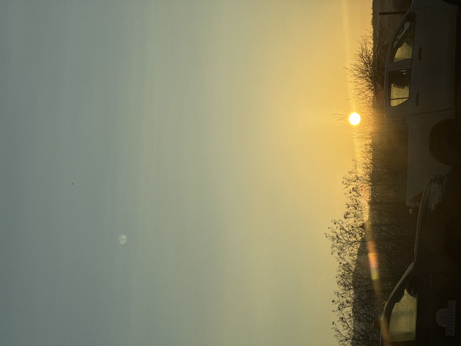 The scene depicts an outdoor environment in Krumovgrad, Bulgaria, at either sunrise or sunset. The sky displays a gradient from light blue-grey at the top to a vibrant yellow-orange at the horizon. A prominent, bright yellow-orange sun is positioned low in the sky towards the right, partially obscured by silhouetted, bare-branched vegetation that stretches across the mid-ground. A distinct circular light anomaly, possibly a reflection or lens flare, is visible in the upper-left quadrant of the sky. In the foreground, two stationary vehicles are partially visible: a dark-colored car with a partial "Dundee" logo on its side is on the left, and a white four-door pickup truck is on the right. A wire fence is discernible behind the white pickup truck on the far right. No individuals are present. The strong backlighting from the sun creates significant lens flare and silhouetted forms.