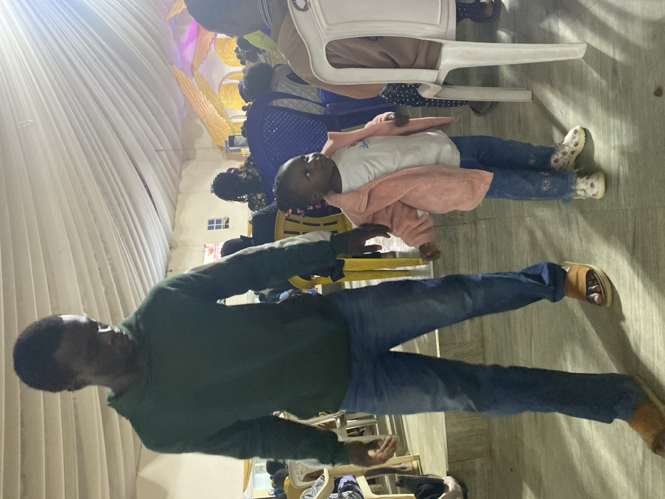 A gathering is taking place in a large room, likely a hall, indicated by draped white fabric. A man stands facing forward, wearing a green shirt and jeans. A child sits in a chair behind him, clad in jeans, a white shirt, and a light pink jacket. Other people are seated in rows of chairs. The room is well-lit, and some decorative elements such as golden wings are visible in the background. The focus is on the man and the child in the foreground.