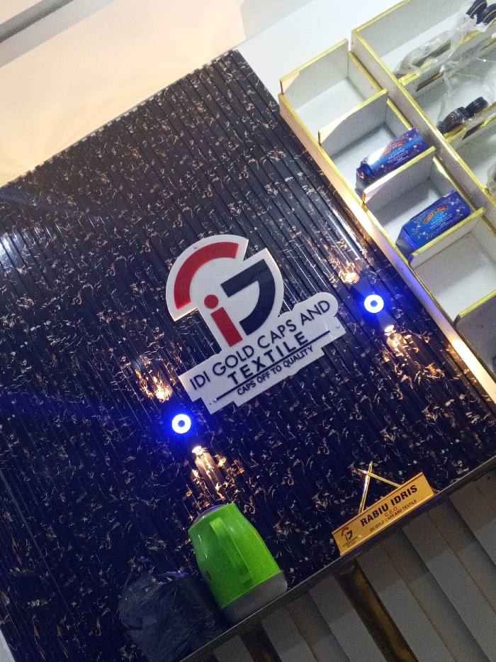 The image displays the interior of the IDI Gold Caps and Textile business located in Akwanga, Nigeria