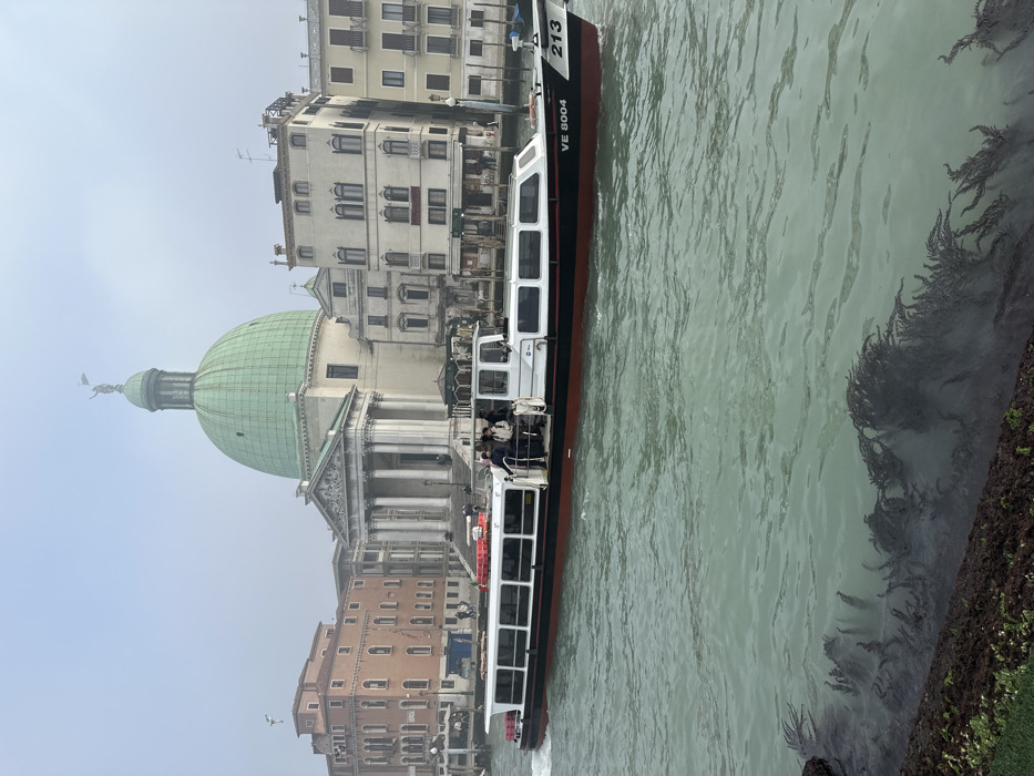 This image depicts a scene on the Grand Canal in Venice, Italy, under an overcast and hazy sky. A multi-passenger watercraft, characterized by a black hull, a red waterline stripe, and a white upper deck, is in motion from left to right, creating a visible wake in the turquoise-green water. The boat displays identification numbers "VE 8004" and "213" on its bow. Several individuals are standing on the boat's open deck area. In the background, the Church of San Simeon Piccolo is prominently visible, featuring a large, light green copper dome and a neoclassical portico supported by four columns. To the left of the church, multi-story buildings with reddish-brown facades line the canal. To the right of the church, additional multi-story Venetian buildings with lighter, off-white facades are present. The immediate foreground shows dense, dark aquatic vegetation, partially submerged and exposed along the water's edge.