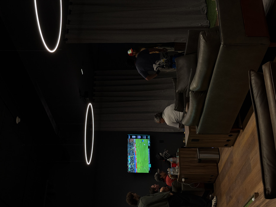 This image depicts an indoor entertainment lounge located in the city of El Pozo, Mexico, characterized by dim lighting and a modern aesthetic. The environment features dark walls, dark grey curtains lining the background, and a polished wooden floor. Overhead, multiple large, circular LED light fixtures illuminate the space. On the left side of the scene, a flat-screen television is mounted on the wall, displaying a live soccer match. Several individuals are present, predominantly male. In the foreground on the left, a man with curly hair, wearing a dark green top, stands partially visible, facing towards the television. To his right, two other men are seated, one wearing a red baseball cap. A wooden side table is positioned in front of these seated individuals, holding various cups and bottles. A metal cylindrical trash receptacle stands beside this table. Further to the right, a man with grey hair, wearing a white polo shirt, is seated on a dark brown leather sofa, facing away from the camera, also seemingly observing the general activity or television. Behind this sofa, another man in a dark blue shirt stands with his back partially to the camera, holding a set of golf clubs in a bag slung over his shoulder. A second dark brown leather sofa is positioned in the foreground, facing towards the right side of the image. The floor in the extreme foreground on the left shows a small section of artificial green turf with a white golf ball on it, indicating a golf-related activity. A subtle white line on the wooden floor suggests a putting line. The presence of golf clubs and the artificial turf points to a golf simulator or practice area within the lounge.