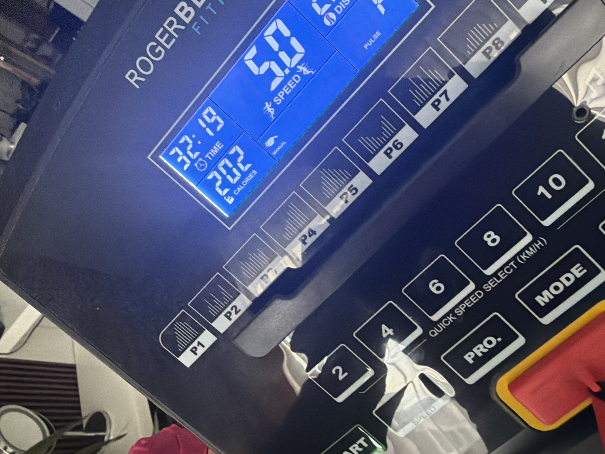 The image displays a close-up, angled view of the dark blue control console of a "ROGERBLACK FITNESS" treadmill. The illuminated blue LCD screen on the console shows "TIME 32:19," "CALORIES 202," and "SPEED 5.0" with a small running person icon. Text labels for "MANUAL," "PULSE," and "DIS" are also visible around the display. Below the screen, eight program buttons (P1 through P8) are arranged, each featuring a graphic representation of an incline profile. Further down, a row of "QUICK SPEED SELECT (KM/H)" buttons displays numbers 2, 4, 6, 8, and 10. Other visible buttons include "START" (partially visible green text), "PRO.", and "MODE." A red safety key is inserted into a yellow-rimmed slot on the lower left of the console. The background, largely out of focus, reveals parts of an indoor environment, including a circular mirror or frame, a green plant, and vertical slats (possibly blinds or wall paneling), suggesting a home or private gym setting. There is no information within the image itself to identify the location as Sofia, Bulgaria.