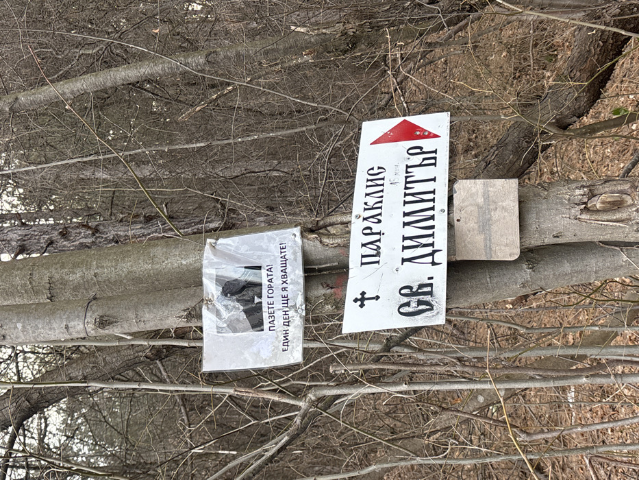 The image displays a close-up of a bare deciduous tree trunk located within a dense forest near Lyaskovo, Bulgaria. Two signs are affixed to the tree. The upper sign is a white, laminated or plastic-covered sheet containing Cyrillic text, "ПАЗЕТЕ ГОРАТА! ЕДИН ДЕН ЩЕ Я ХВАЩАТЕ!" (PROTECT THE FOREST! ONE DAY YOU WILL BE CAUGHT!), along with a partially obscured, dark, possibly silhouetted image. Below this, a white rectangular sign with black Cyrillic text reads "† ПАРАКЛИС СВ. ДИМИТЪР" (CHAPEL ST. DIMITAR), indicating a religious site. This sign includes a small handwritten "45 мин." (45 min.) and a red triangular arrow pointing right. A smaller, blank, weathered wooden or metallic plaque is attached beneath the chapel sign. The surrounding environment consists of numerous slender, bare tree branches and trunks, indicative of a dormant season such as late autumn or winter.