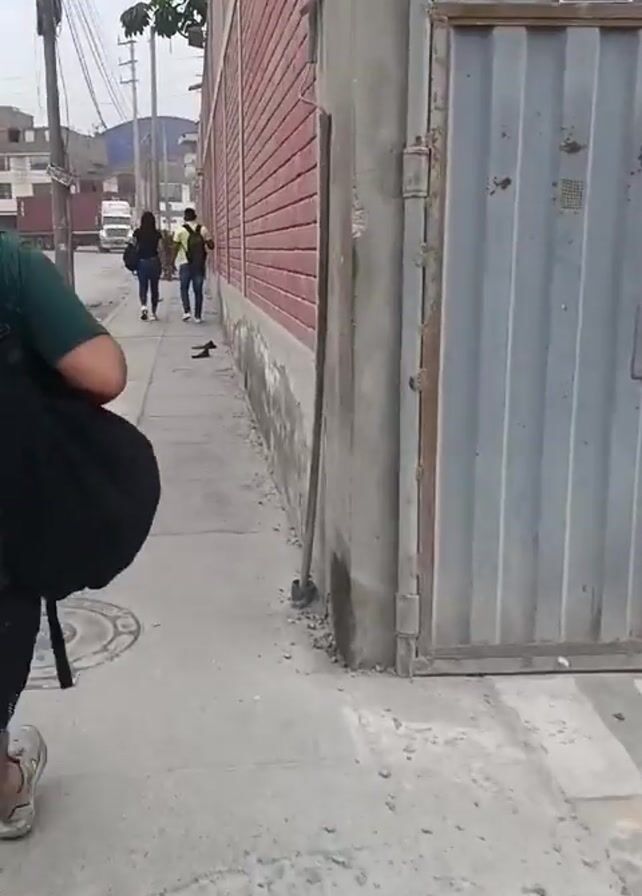 A person wearing a green shirt and black shorts walks along a sidewalk next to a brick building. They are carrying a black bag over their shoulder. Other people are walking ahead on the sidewalk, further down the street. A large gray metal door with a sign indicating truck access is visible next to the person walking. Power lines are visible above.