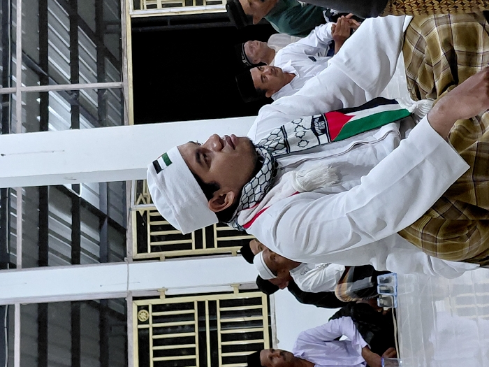 This image depicts an indoor gathering in Pulo Drien, Indonesia. The central subject is a young adult male, seated on a light-colored, reflective floor, observed in profile facing right. He wears a white long-sleeved shirt, a brown and white plaid sarong, and a white skullcap featuring a horizontal black, white, and green stripe emblem. Around his neck is a black and white keffiyeh scarf with red and green stripe accents, patterned with geometric shapes and text. His right hand rests on his lap, and his expression is neutral. Behind and to his left, several other men are also seated on the floor, dressed in light-colored shirts and some wearing skullcaps. Two clear plastic cups are visible on the floor near them. The background reveals white interior walls, white support pillars, and window-like openings with vertical bars and ornate gold-colored accents. Above, a corrugated metal roof structure is visible, supported by white beams. The artificial lighting illuminates the scene. The individuals appear to be attending a collective event.