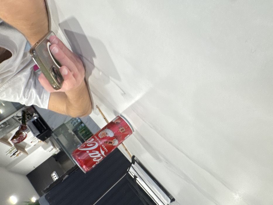 An interior scene depicts a partial view of a commercial establishment, specifically a pizzeria or cafe, located in Mirandela, Portugal. The foreground and midground are dominated by a white, semi-reflective table surface. On the table, a red Coca-Cola can, featuring Christmas-themed Santa Claus graphics and the text "SABOR ORIGINAL" (Original Flavor), stands near the left-center. A slender, light-colored object, consistent with a wooden or bamboo straw, rests diagonally behind the can. To the right, the lower torso and forearms of an individual wearing a white short-sleeved shirt are visible. Their hands firmly grasp a smartphone encased in a translucent, olive-colored protective cover, with the camera module visible on the device's rear. The background to the left reveals a dark, possibly black, vertical partition, behind which a white sign fragment displaying "ZZA" is mounted on a wall. Towards the center-right of the background, a service counter is visible, featuring a refrigerated display unit. Above the counter, wall-mounted shelves hold bottles and decorative elements, alongside a dark appliance positioned on the counter surface.