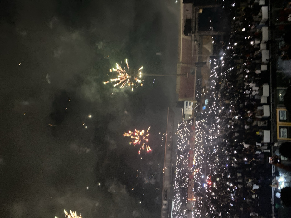 Fireworks explode in the dark sky above a large crowd of people. The crowd is gathered in an open area near buildings, and many are holding up their phones, creating a sea of small white lights. The fireworks are bright and colorful, with multiple bursts of light illuminating the scene. The overall atmosphere suggests a celebration or event.