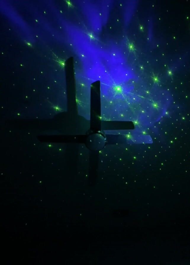 A low-light video shows a room illuminated by a star projector