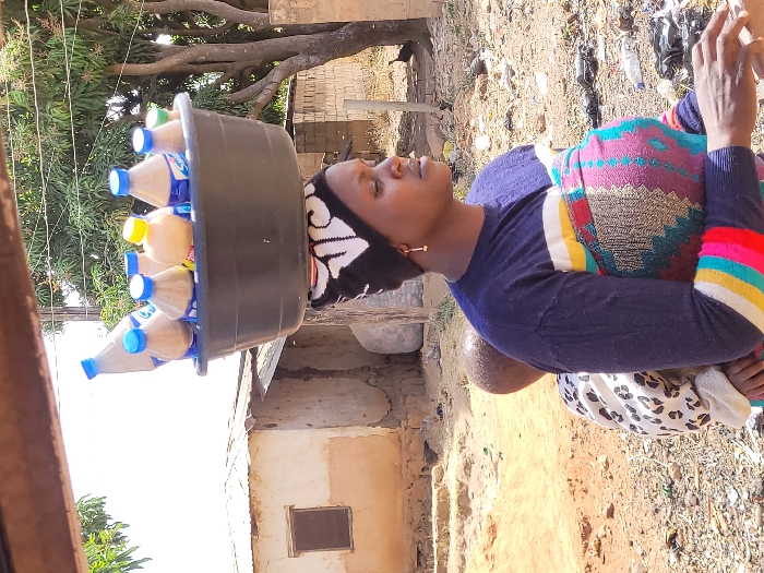 In Udu, Nigeria, a woman stands under bright daylight, facing right with a focused expression. She carries a large black plastic basin on her head, filled with approximately nine plastic bottles containing light-colored liquid; most have blue caps, and some are "Satis" branded. She wears a dark blue long-sleeved top with multi-colored striped cuffs and a black and white patterned head covering, with a small gold-colored earring visible on her right ear. A baby, swaddled in a colorful patterned fabric, is carried on her back, wearing a white leopard-print outfit. The immediate environment consists of dry, reddish-brown dirt, with scattered refuse on the right. In the background, a single-story building with light-colored mud walls and a corrugated metal roof is visible on the left, along with distant green trees and other structures. A black chicken is present in the mid-ground on the right. A dark horizontal beam partially obscures the top of the frame.