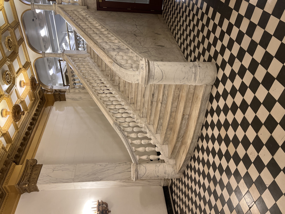 An ornate marble staircase ascends, featuring decorative balusters