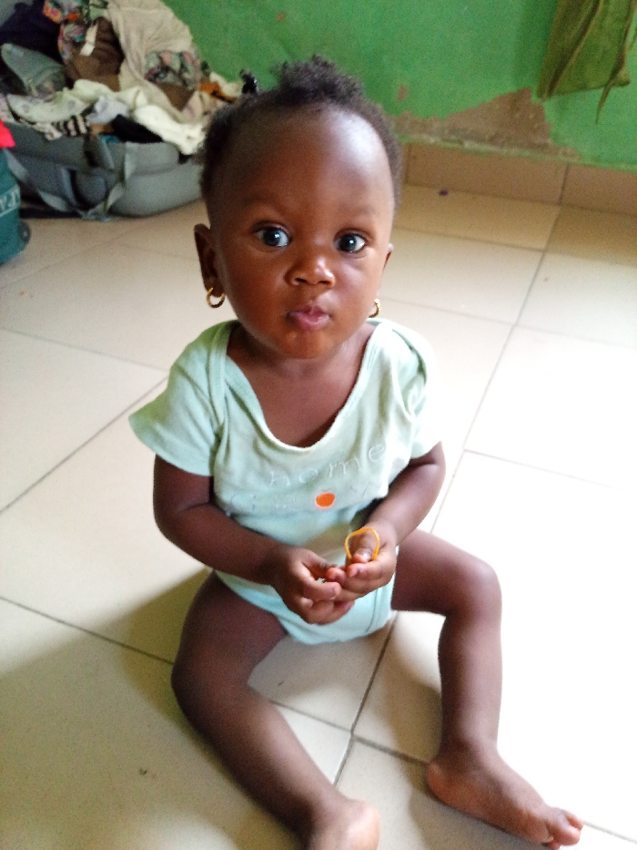 An infant is observed sitting on a tiled floor in a room located in Zango-ndaji, Nigeria