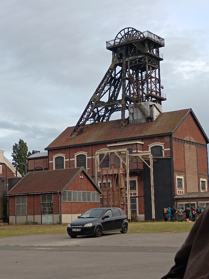 large, industrial structure, a former coal mine headframe, located at the coordinates 50.461, 2.986, in the city of Oignies, France. It is a large, steel and iron structure with a wheel at the top and a series of platforms and walkways. The headframe is situated in front of a red brick building with a brown roof, and a small, black car is parked in front of the building. There are several people standing on the ground in front of the building, and another individual is seated in the foreground, obscuring a large portion of the image. The sky is overcast and the ground is paved with asphalt.