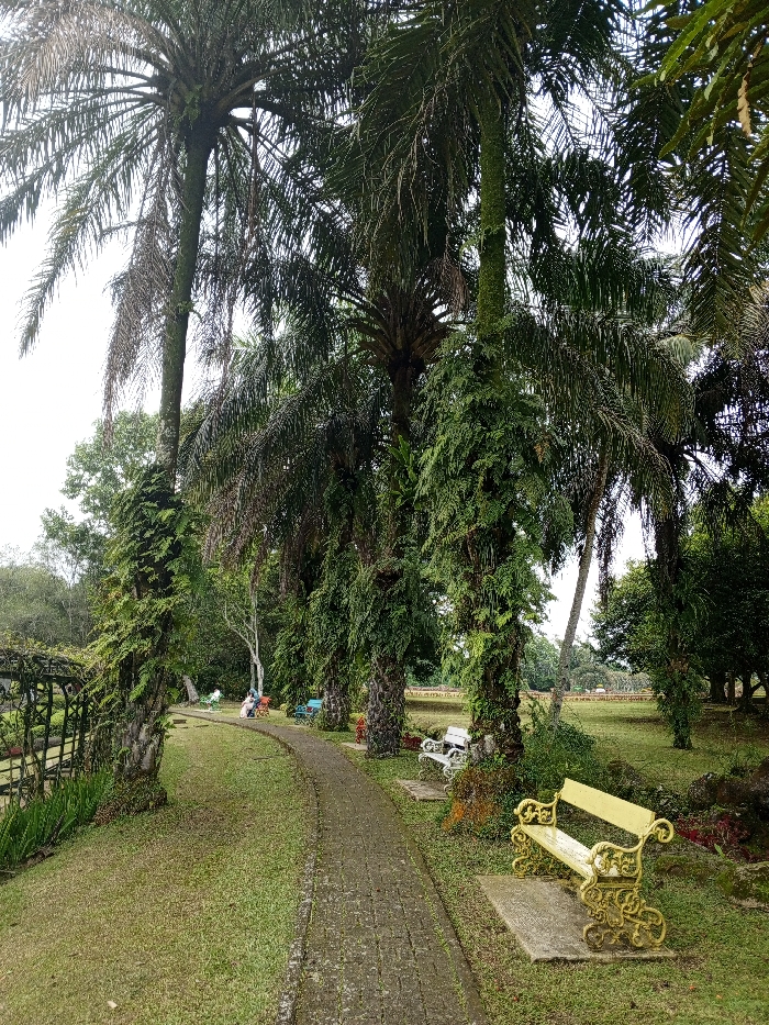 - "A brick walkway winds through a park lined with tall palm trees heavily draped in greenery" by FM-cvL2y1, licensed under CC BY 4.0