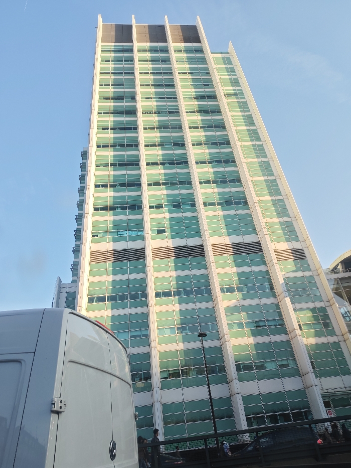 - "This low-angle exterior photograph depicts a tall, multi-story building with a green-tinted glass and white-paneled facade, dominating the frame against a clear, light blue sky in the city of Unknown, Unknown" by FM-PRaCh1, licensed under CC BY 4.0
