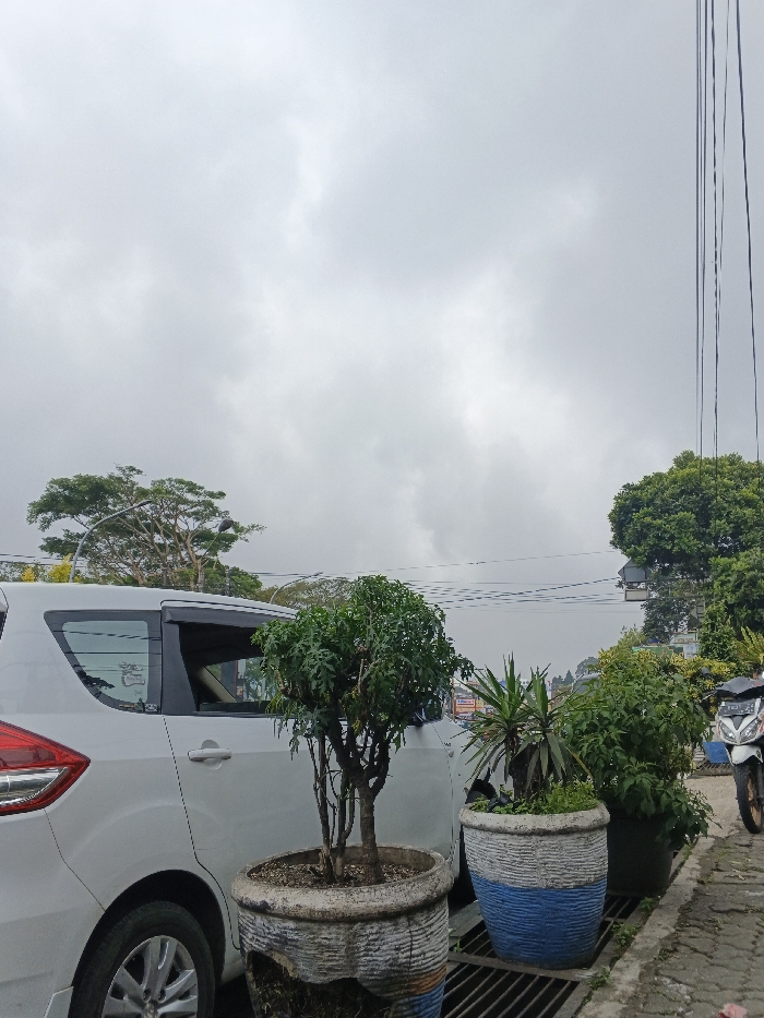 This image depicts an urban street scene in the city of Bien Hoa, Vietnam, under an overcast sky. In the foreground, a significant portion of a white multi-purpose vehicle (MPV) or SUV is parked on the left, with its rear left side visible, facing away from the viewer. Adjacent to the vehicle, on what appears to be a sidewalk or paved area, are several potted plants. The closest planter is a large, weathered, textured concrete pot, partially damaged at its base, containing a small tree with green foliage. To its right, another similarly textured concrete planter, painted with blue and white sections, holds a yucca-like plant and smaller greenery. These planters rest on or near a metal drainage grate. Further to the right, the front wheel and part of the bodywork of a dark-colored scooter or motorcycle are visible, indicating another parked vehicle. The background features abundant green foliage from various trees, suggesting a lush, tropical environment. Numerous black overhead power lines and utility poles traverse the upper mid-ground of the image. A street light fixture is partially visible above the white vehicle. The distant background shows faint outlines of structures or buildings through the trees and atmospheric haze. No individuals are visible in the scene, and no specific actions or interactions are occurring.