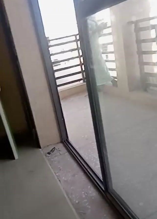 n interior room, focusing on a small green and white desk and a sliding glass door that leads to a balcony with a black railing. The floor is tiled in a light color. A person is briefly visible sitting on a chair near the desk, wearing tan pants and sandals. There is also a bag on the desk. The camera moves around the desk and door. The room is well-lit.