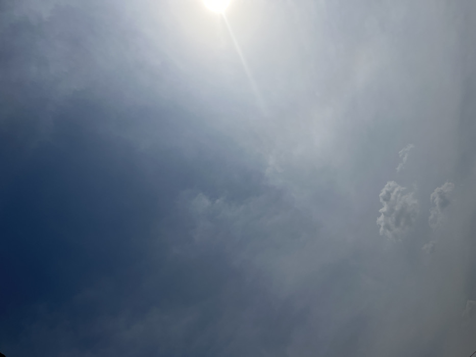 The image displays an expansive view of the sky over Kaduna South, Nigeria. The upper left quadrant features a gradient of deep to light blue sky with varying densities of diffuse cloud cover. Towards the upper right and extending diagonally into the mid-right, a brilliant, intense light source, consistent with the sun, is prominent, producing a strong glare and a distinct diagonal light ray. The sky in the vicinity of this light source is a hazy, bright white. Several distinct, small to medium-sized cumulus cloud formations are present in the lower central portion of the frame. No individuals, man-made objects, or terrestrial features are visible within the scene; the image is entirely composed of atmospheric elements and celestial light.