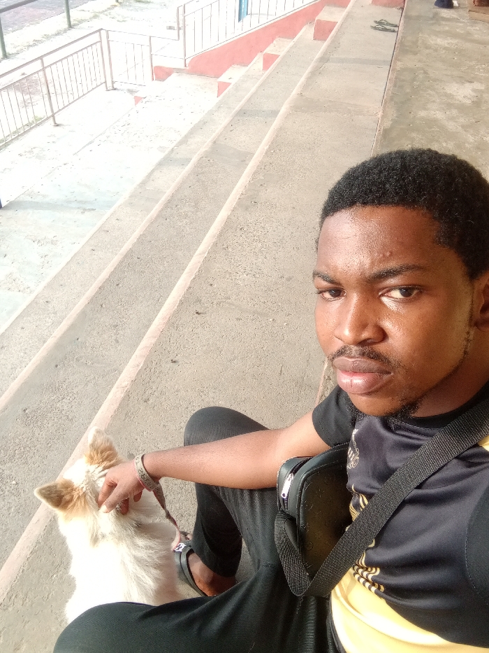 A young man sits on concrete steps with a small, white and brown dog. The man wears a black and yellow shirt, black pants, and sandals. A black bag is slung across his shoulder. The dog sits next to him, looking to the side. The concrete steps ascend behind them, leading to a metal railing and red-painted areas. The scene is bathed in bright sunlight.