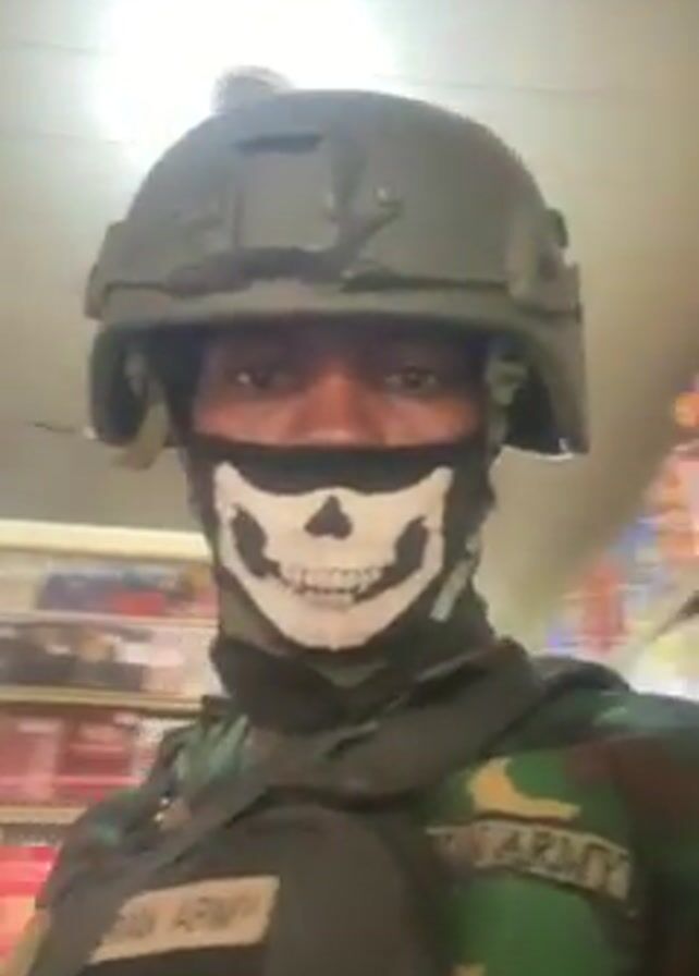 A person wearing a military helmet, a camouflage uniform with a "NIGERIAN ARMY" patch, and a skull-patterned face mask is standing in what appears to be a small store or shop
