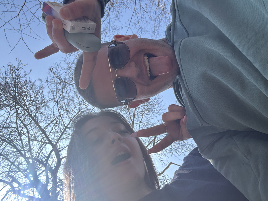 A low-angle selfie depicts two individuals outdoors in Plovdiv, Bulgaria, under a clear blue sky with bare tree branches visible in the upper background. Bright sunlight causes a lens flare on the left side of the image. On the left, a female subject with dark hair is partially visible, wearing a dark top. Her left hand is raised, displaying a ring on her ring finger and light pink nail polish, forming a V-sign. Her mouth is open. On the right, a male subject wears dark sunglasses and a light green hooded sweatshirt. He has his mouth open with his tongue extended. His right hand is raised, forming a V-sign, while simultaneously holding a light grey electronic vaping device and a small white rectangular package, consistent with a refill cartridge box, between his thumb and fingers.