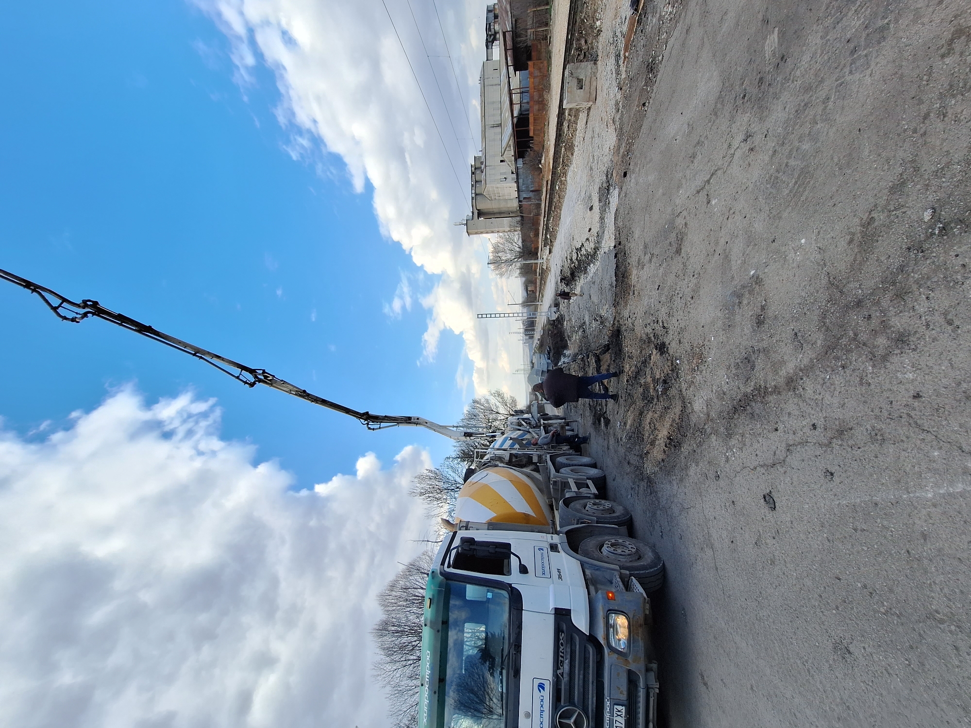 The image depicts an active concrete pouring operation within an industrial area adjacent to a railroad track, under a partially cloudy sky
