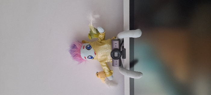 This image depicts an indoor scene in Karnobat, Bulgaria. A light blue plush doll with large blue eyes, pink and purple spiked hair, and red lips is seated on a white shelf. The doll is dressed in a shiny gold, hooded jacket and has light blue, elongated limbs. It holds a small yellow bird plush toy in its left hand and a small green bird plush toy with a prominent white feathered tail in its right hand. A gray Logitech webcam is positioned directly in front of the doll's torso, resting on the same white shelf. The doll's light blue legs dangle over the edge of the shelf, above a dark, reflective surface consistent with a computer monitor. The background consists of a plain white wall.