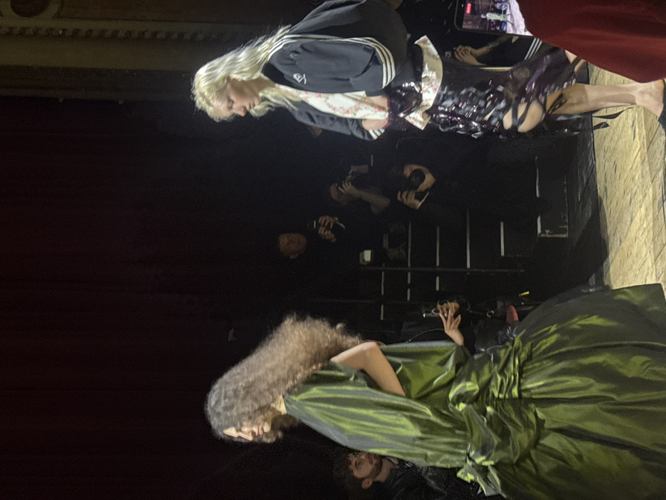 Two models on a stage are captured at a fashion show. One model with blonde hair wears a short black jacket, a floral top, and a sequined skirt. The second model has long, curly brown hair and wears a large, shimmering green dress. A group of photographers is positioned between the models, capturing the event. The stage is lit dimly, with dark curtains in the background.