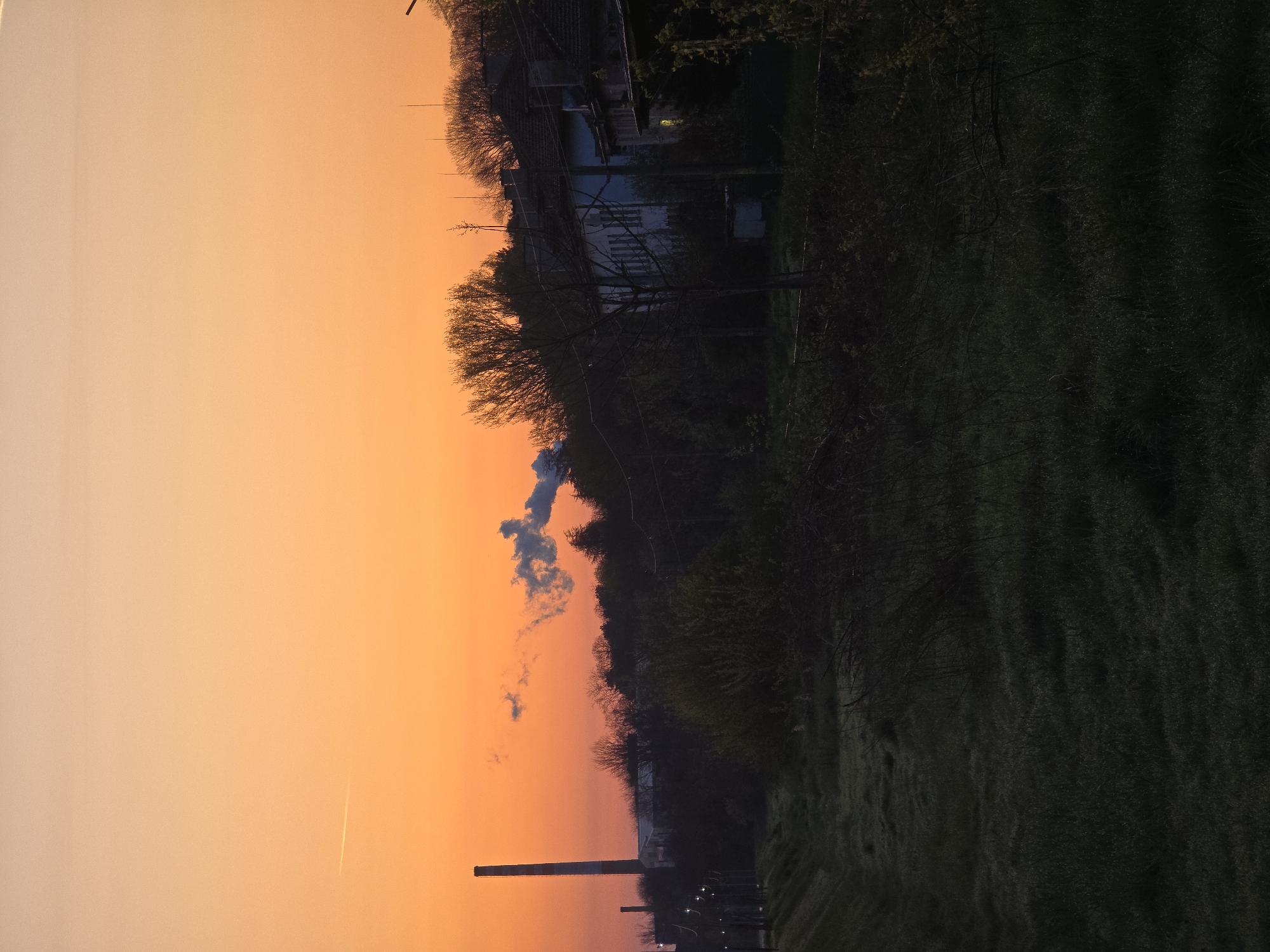 sunset in Ruse, Bulgaria. The sky is a gradient of orange, with a dark silhouette of trees and a building in the middle ground. A tall smokestack is visible on the left side. In the foreground, there is a dark, grassy area. A small cloud is also visible in the sky.