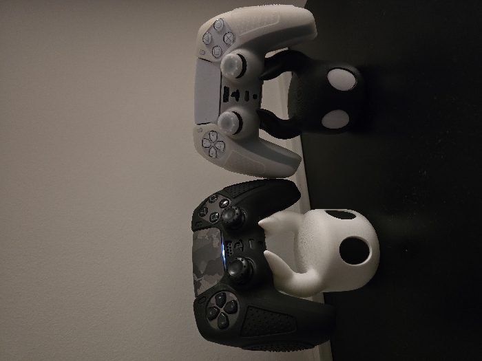 The scene is located indoors within the city of Kumanovo, North Macedonia. Two PlayStation DualSense controllers are displayed on decorative stands atop a dark, flat surface, against a plain, light-colored wall. On the left, a black DualSense controller, featuring a grey camouflage pattern on its central panel and a textured black grip, rests on a white stand sculpted to resemble the head of 'The Knight' character from the video game Hollow Knight, with two distinct black circular eye openings. A subtle blue light emanates from the black controller's central interface. On the right, a standard white DualSense controller rests on a black stand, identically sculpted as 'The Knight' character, with two distinct white circular eye openings. No individuals are present. The area is illuminated by ambient, diffuse light.