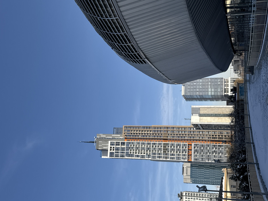 A low-angle shot reveals a cityscape dominated by modern architecture against a clear blue sky. Several high-rise buildings of varying heights and designs are visible. An expansive, curved metallic structure with a gridded underside looms overhead, partially obscuring the view. A snowy surface and metal railing suggest a walkway or bridge. The image composition emphasizes the scale and contrast between the sky, structures, and urban elements.