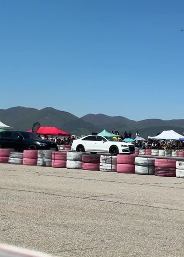 The video depicts a drag race between two cars on a paved track. The cars, a black BMW hatchback and a white Audi sedan, accelerate rapidly from a stationary position. They are separated by a barrier made of stacked tires painted in pink and white. A crowd of spectators watches from behind tents and other structures at the edge of the track. Mountains are visible in the background under a clear blue sky. The camera moves as the cars race, and briefly obstructs the view.