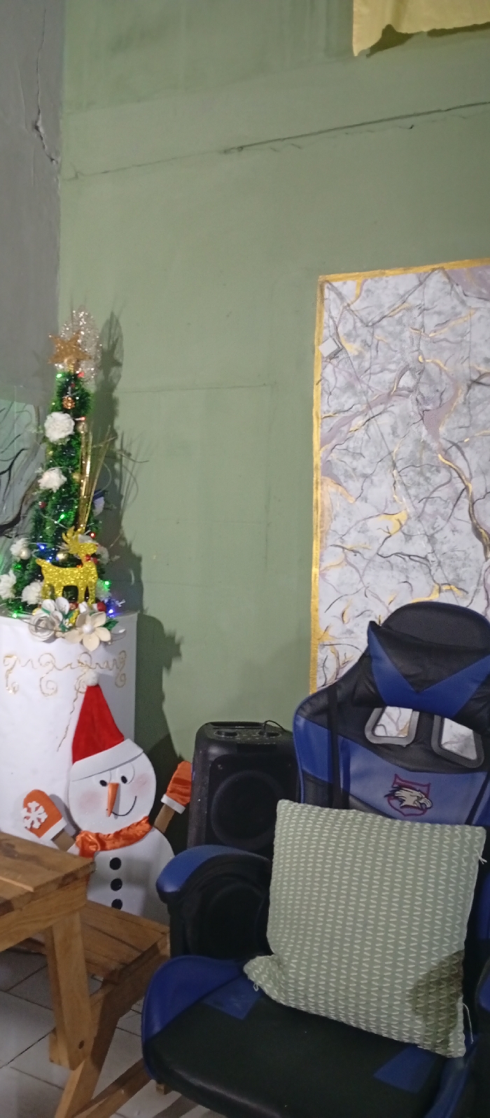A small Christmas tree with a golden star and reindeer stands on a white cylindrical base next to a snowman figure. A black speaker sits near a blue and black gaming chair with a green pillow. An abstract painting with gold accents hangs on the green wall behind the chair. A wooden table is partially visible on the left side. The corner of the wall exhibits a crack.
